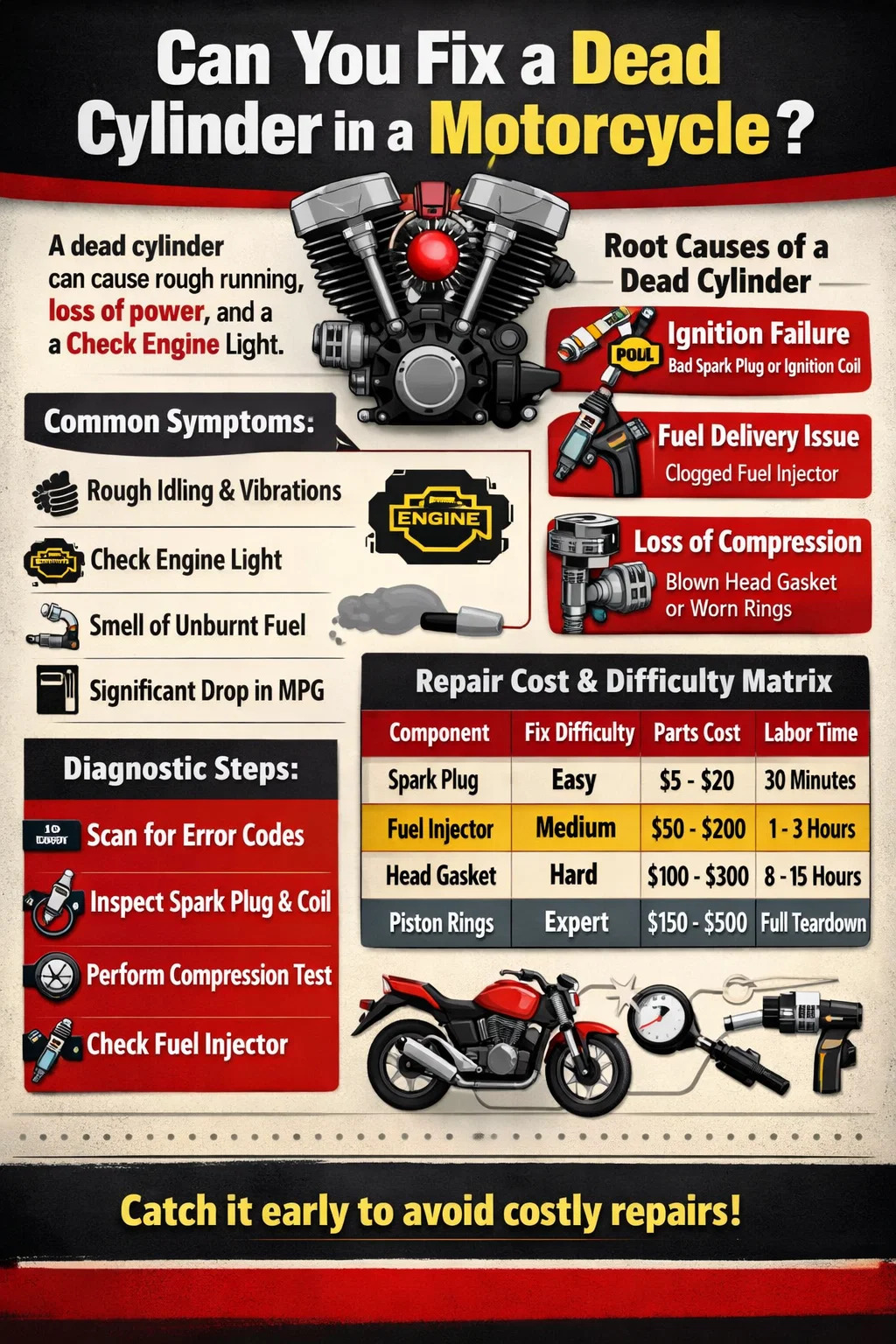 Bevor Sie in die Werkzeuge eintauchen, müssen Sie sicherstellen, dass ein Zylinder tatsächlich nicht mehr feuert. Ein toter Zylinder erzeugt einen deutlichen „Schluckauf“ oder eine rhythmische Vibration, weil das Gleichgewicht des Motors gestört ist. Für einen Fahrer auf einem Motorradzylinder Beim Setup wird dies häufig als erheblicher Leistungsverlust und als Veränderung des Auspuffgeräuschs empfunden, das gedämpft oder „abgehackt“ klingen kann.