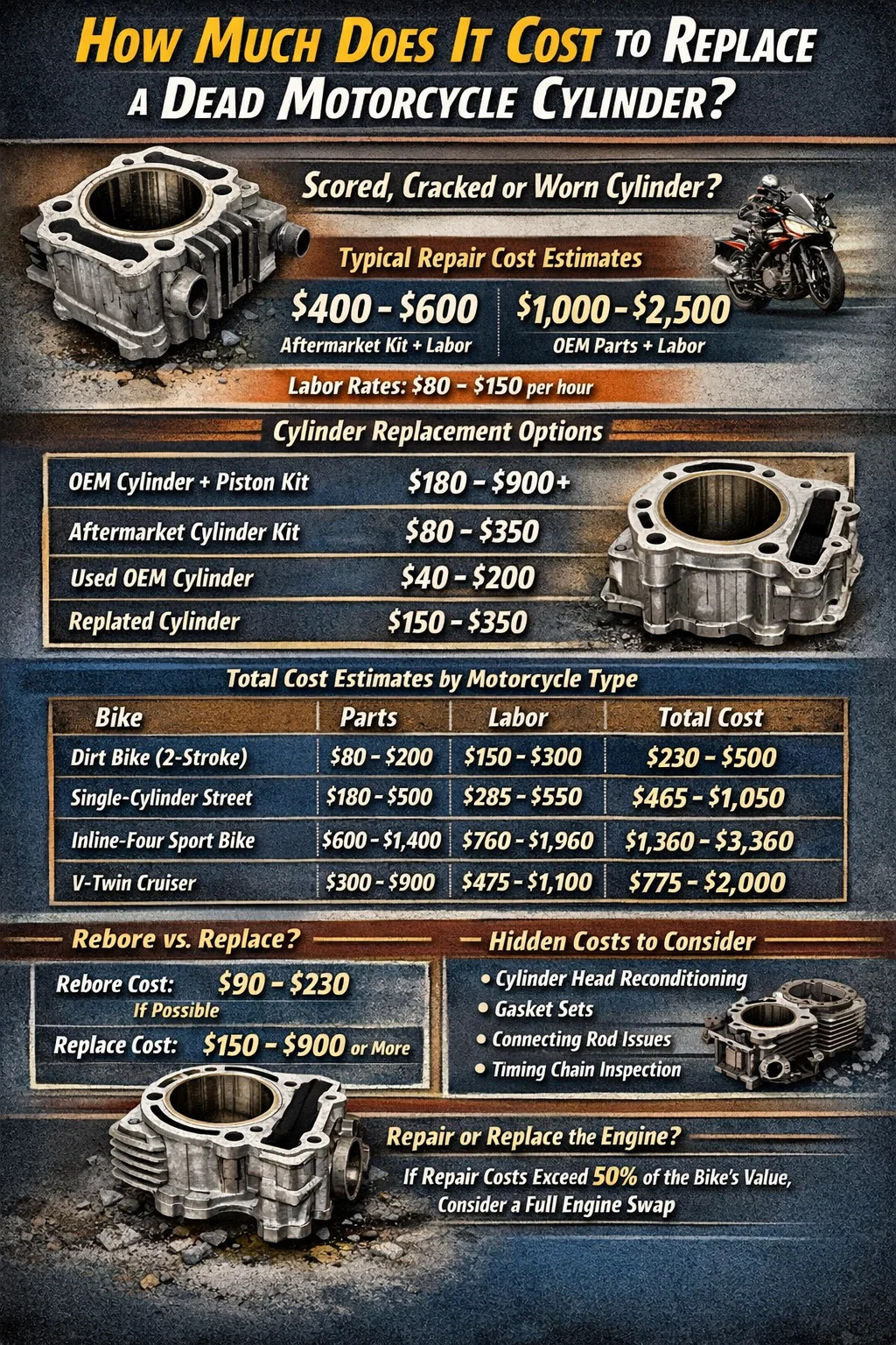 Combining parts and labor, here is a realistic picture of what you will spend on a full motorcycle cylinder replacement across common bike categories.