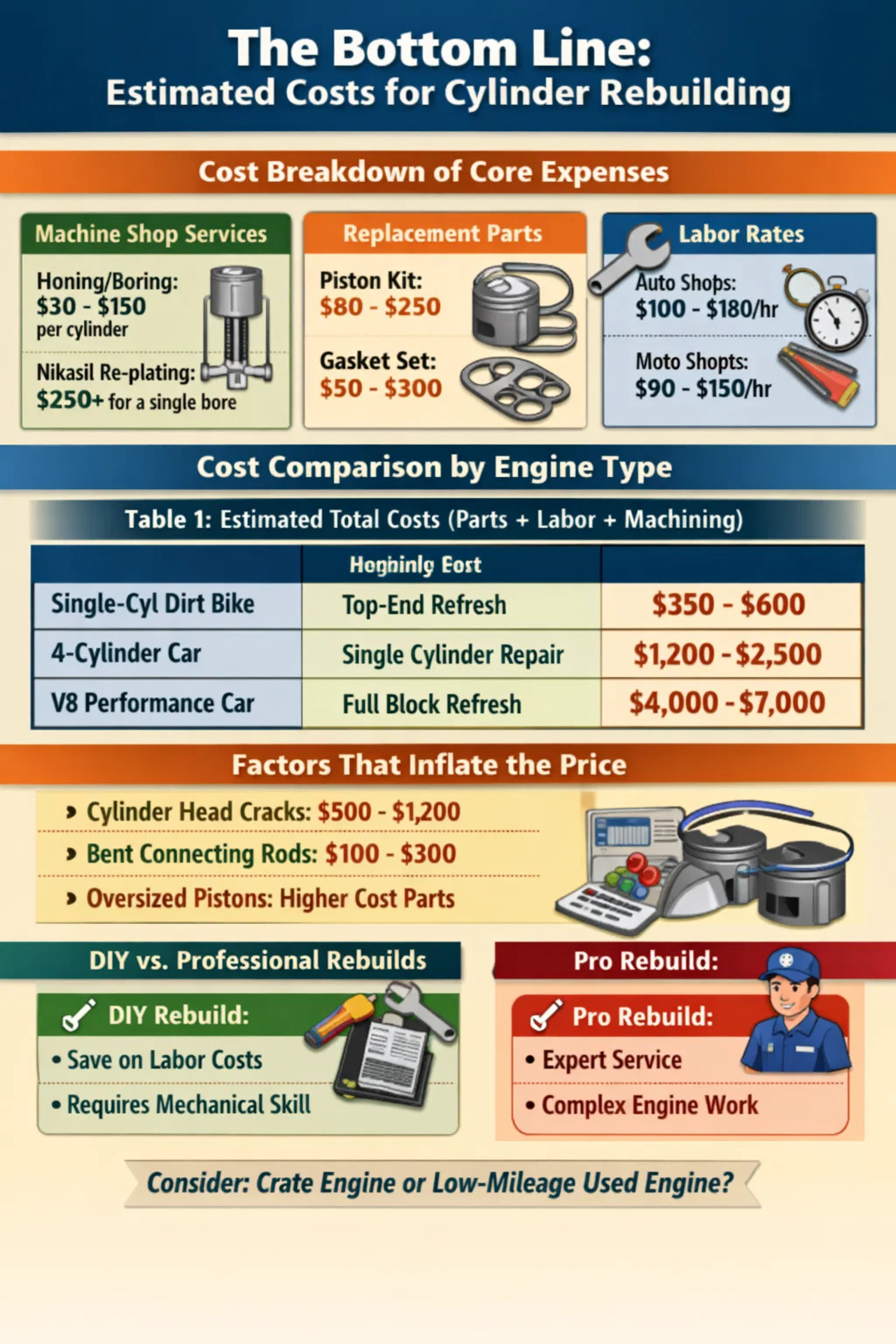 Die Kosten für den Wiederaufbau eines Zylinders liegen im Allgemeinen zwischen 500 bis 1.500 US-Dollar pro Zylinder für Automobilmotoren, während ein einziger Motorradzylinder kann zwischendurch oft aufgefrischt werden 300 $ und 800 $ . Diese Zahlen variieren stark, je nachdem, ob Sie eine „Top-End“-Auffrischung (Ringe und Dichtungen) oder eine vollständige mechanische Restaurierung mit Bohren, Honen und übergroßen Kolben durchführen. Wenn Sie die Demontage selbst durchführen, können Sie erheblich Arbeitsaufwand einsparen, der normalerweise ausfällt 60 % bis 70 % der Gesamtrechnung.