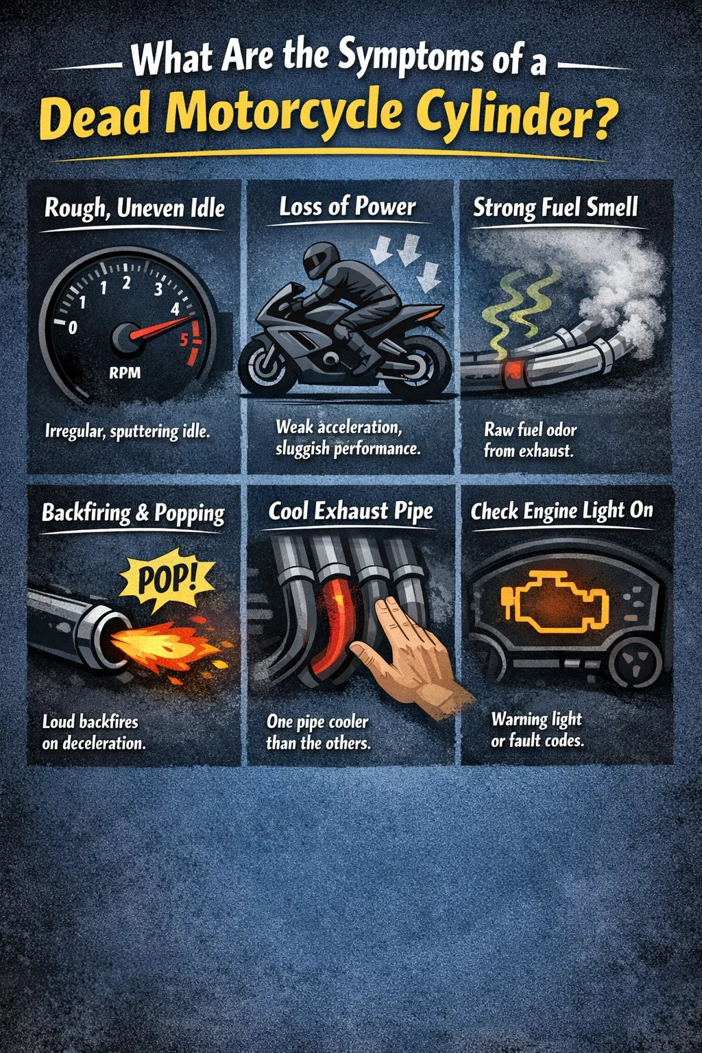 Die direkteste Antwort: Wenn Ihr Motorrad unruhig läuft, die Leistung merklich nachlässt, nach unverbranntem Kraftstoff riecht oder im Leerlauf und unter Last Aussetzer auftritt, ist die Wahrscheinlichkeit groß, dass einer Ihrer Zylinder nicht mehr zündet. In diesem Artikel erfahren Sie, wie Sie das Problem bestätigen, welche Ursachen es haben und wie Sie es beheben können.