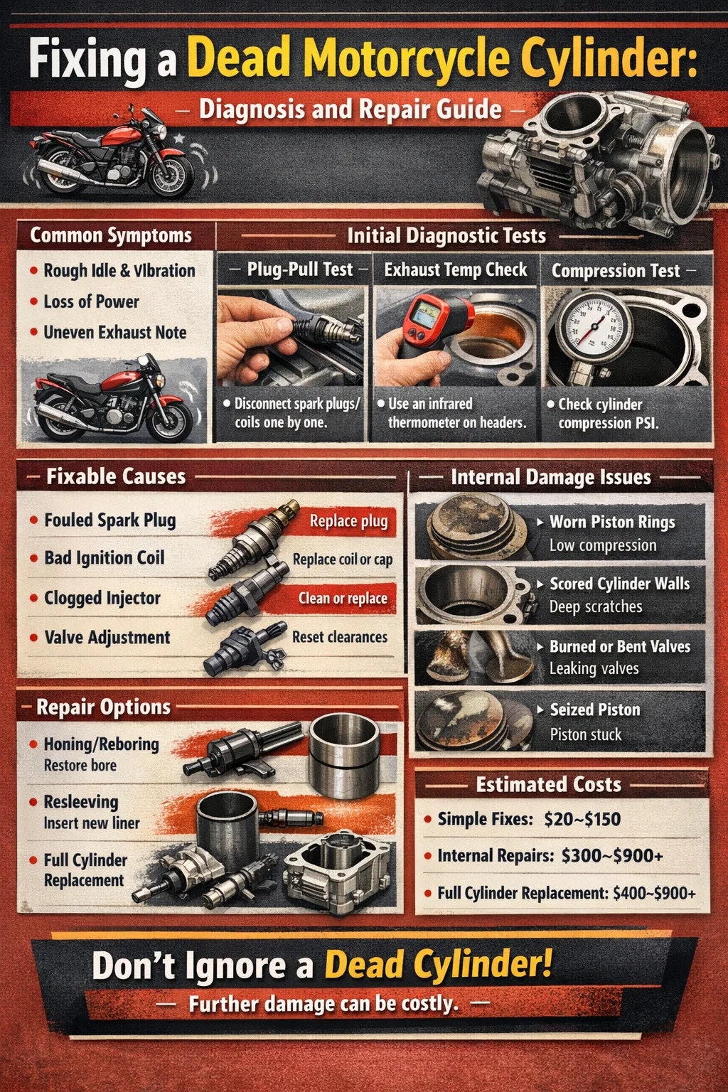 Bei einem Motorrad bedeutet ein toter Zylinder, dass eine Brennkammer nicht mehr zur Motorleistung beiträgt. Bei einem Einzylinder-Motorrad bedeutet dies, dass der Motor überhaupt nicht laufen kann. Bei einem Paralleltwin, V-Twin oder Reihenvierzylinder halten die verbleibenden Zylinder den Motor am Leben, aber das Motorrad fühlt sich merklich schwächer an, vibriert stärker als gewöhnlich und der Auspuffsound klingt ungleichmäßig oder schief.