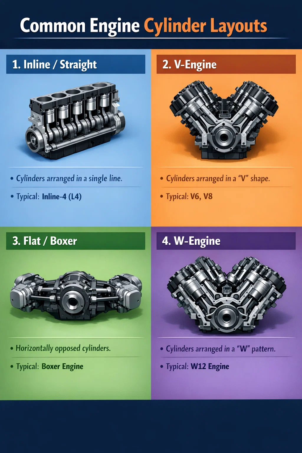 Anwendungen: Dieses Layout ist relativ selten, die bekanntesten Beispiele sind Porsche und Subaru. Auch bei Motorrädern ist der berühmte „Boxer“-Motor ein Paradebeispiel für diesen Aufbau.