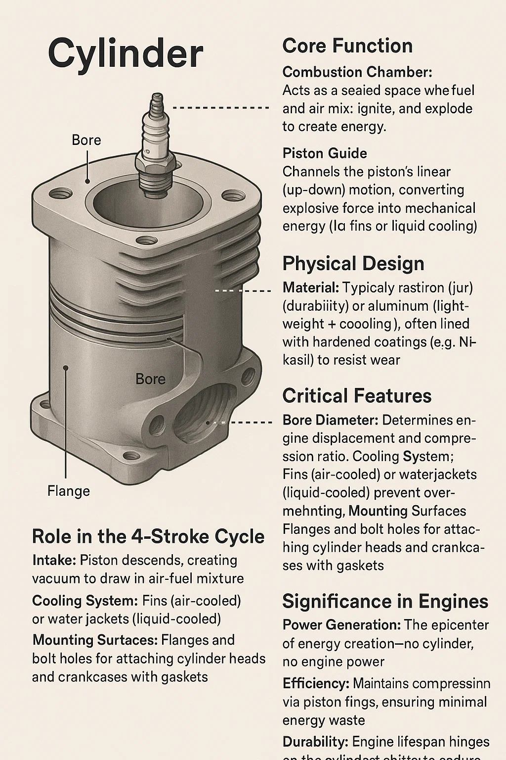 Material: Typischerweise Gusseisen (Haltbarkeit) oder Aluminium (leichte Kühlung), häufig mit gehärteten Beschichtungen (z. B. Nikasil) ausgekleidet, um Verschleiß zu widerstehen.