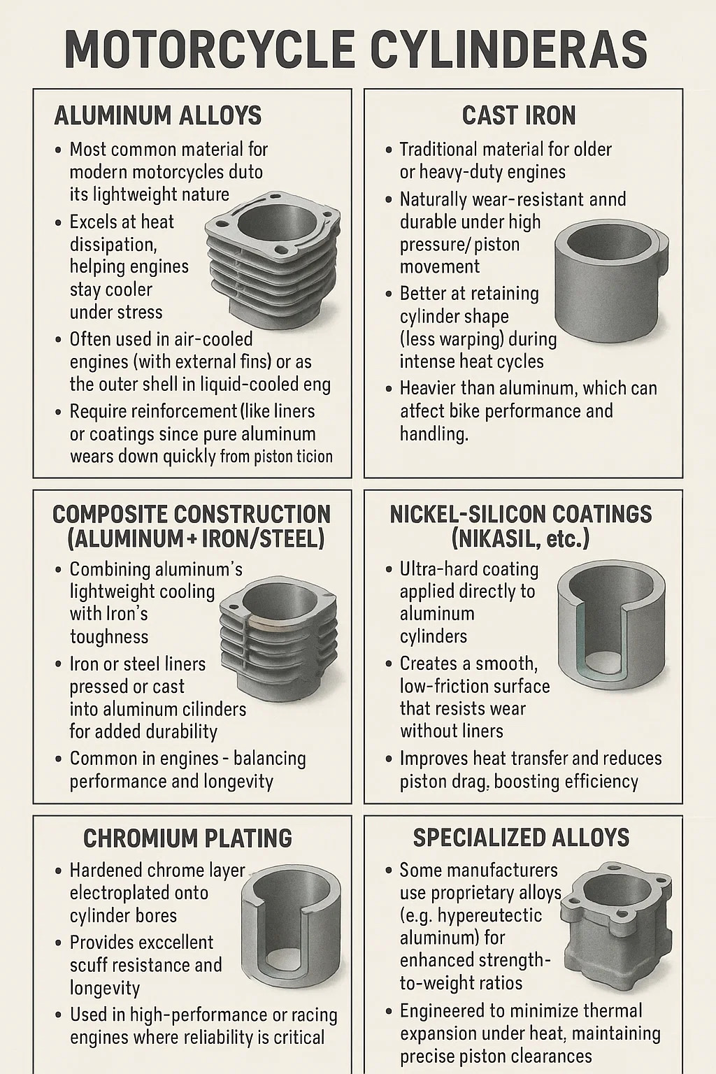 Motorradzylinder werden hauptsächlich aus Metallen hergestellt, die aufgrund ihrer Festigkeit, Hitzetoleranz und Haltbarkeit ausgewählt wurden. Hier finden Sie eine detaillierte Aufschlüsselung gängiger Materialien und ihrer Eigenschaften: